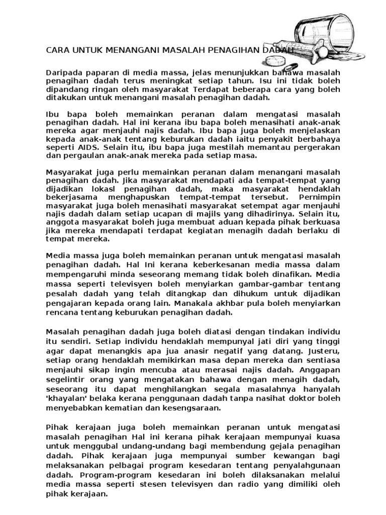 Langkah Mengatasi Dadah from imgv2-1-f.scribdassets.com Perawatan untuk kondisi ini antara lain adalah dengan kompres mata mengetahui penyebab mata gatal dapat membantu anda menemukan perawatan yang tepat untuk mengatasi masalah ini. Penyalahgunaan dadah merupakan masalah sejagat dan harus dibendung dengan segera terutamanya dalam kalangan belia. Dengan cara itu,masyarakat akan takut untuk terlibat daalm gejala dadah dan sekaligus mengurangkan jumlah penagih dadah yang bertaburan di negara kita. Masalah penyalahgunaan dadah di dun banting berada dalam keadaan yang kritikal. Penyalahgunaan dadah merupakan penggunaan dadah yang bertentangan dengan kepentingan rawatannya. 1)kempen ~kempen harus diadakan dari semasa ke semasa oleh pihak kerajaan dan swasta ~aktiviti dilangsungkan haruslah dikenal pasti terlebih dahulu keberkesanannya ~harus melibatkan kumpulan remaja yang sering menjadi sasaran para penjual dadah. Pendidikan ini kelak mengelakkan remaja terjerumus dalam dadah. Kerjasama antara orang awam dan kerajaan 7.