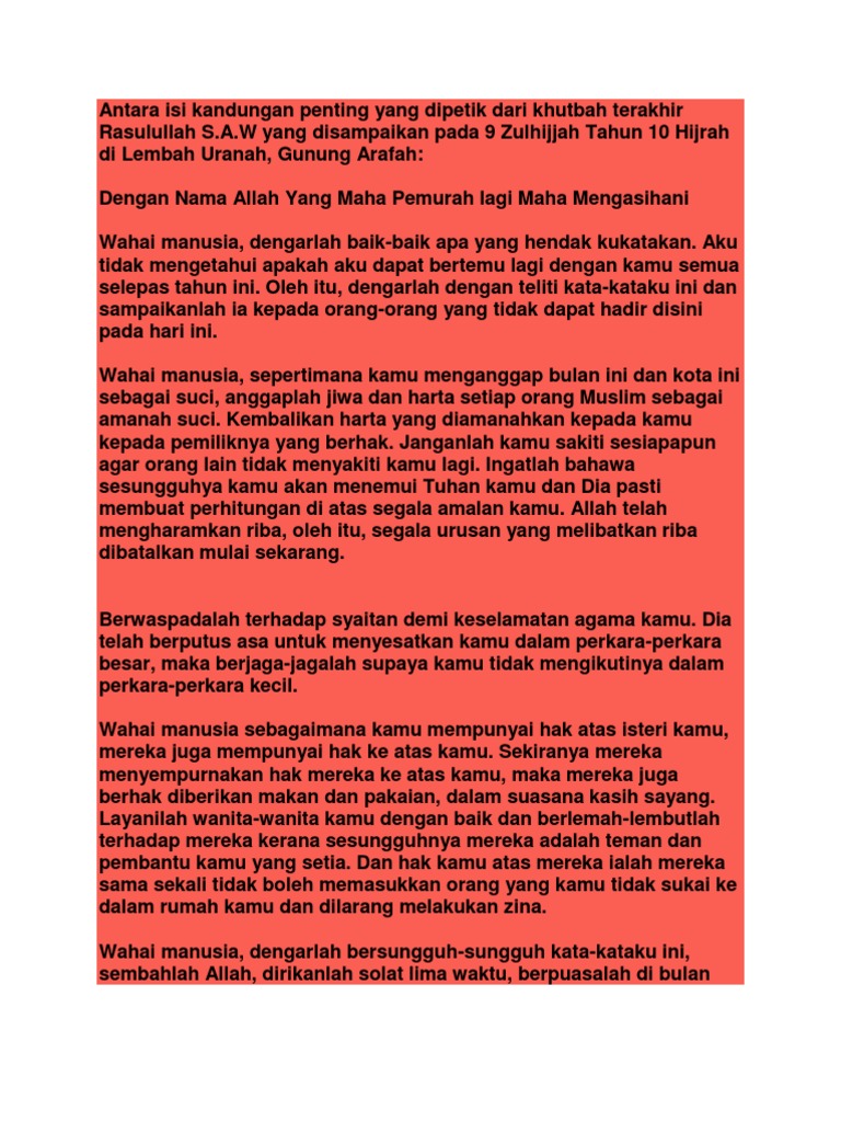 Khutbah terakhir nabi muhammad s.a.w tarikh : Terdapat lima rukun khutbah jumat yang mana disyariatkan menggunakan bahasa arab, dilakukan dengan tertib sesuai urutan dan. Description of pesanan khutbah terakhir nabi. Jakim moga kita sentiasa mengingati nabi muhammad s.a.w. It is compatible with all android devices (required android 4.1+). Zulhijjah tahun 10 hijriah tempat : Khutbah jumat sendiri memiliki rukun yang wajib dipenuhi. 0%0% found this document useful, mark this. Ia berlaku pada peristiwa haji wida' muhammad yakni pada 9 zulhijjah tahun 10 hijrah di lembah uranah, bukit arafah. May the latter better understand my words than those who hear from me. Wahai manusia, tidak akan ada lagi nabi dan rasul selepas ketiadaanku dan tidak akan lahir agama baru. Khutbah terakhir nabi muhammad saw ketika haji wada' di lembah uranah, gunung arafah. Khutbah terakhir nabi muhammad saw ketika haji wada' di lembah uranah, gunung arafah.