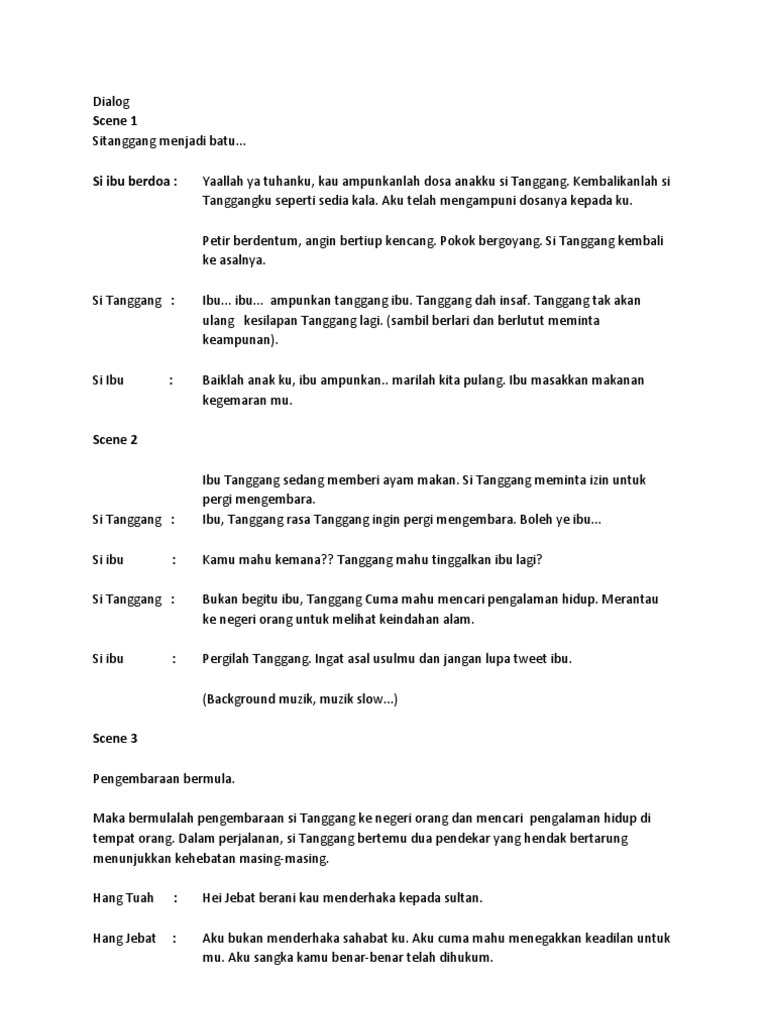 Merdeka atau mati | contoh skrip drama kepahlawanan. Contoh naskah drama legenda batu menangis. Anda wajar mengikut format yang standard apabila menulis skrip supaya ia mudah dibaca, difahami oleh pengarah drama dan yang penting ia menunjukkan yang anda memahami genre sastera yang anda tulis. Sidang media pesta lawak the return of pi mai pi penulisan skrip drama radio/tv/filem: Di belakang meja itu berdirinya 3 boneka yang tangannya telah diikat dengan tali dari siling.